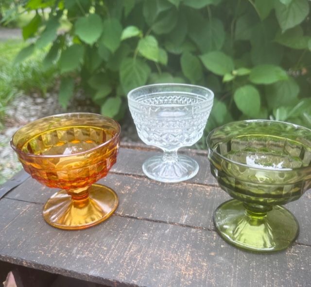 Long before champagne flutes arrived starlets and dignitaries alike enjoyed their bubbly from beautiful champagne coupes. Choose from amber, green and pink vintage coupes ~ or mix-match!